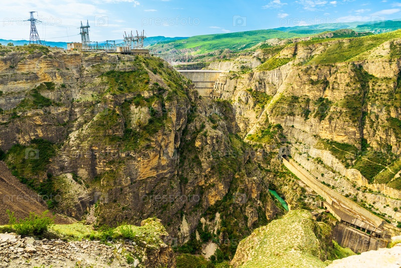 Потрясающий вид на Чигрийскую гидроэлектростанцию на горной реке Сулак в горах Северного Кавказа Дагестана