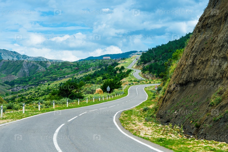 Живописный горный пейзаж с извилистой асфальтовой дорогой.Кавказ