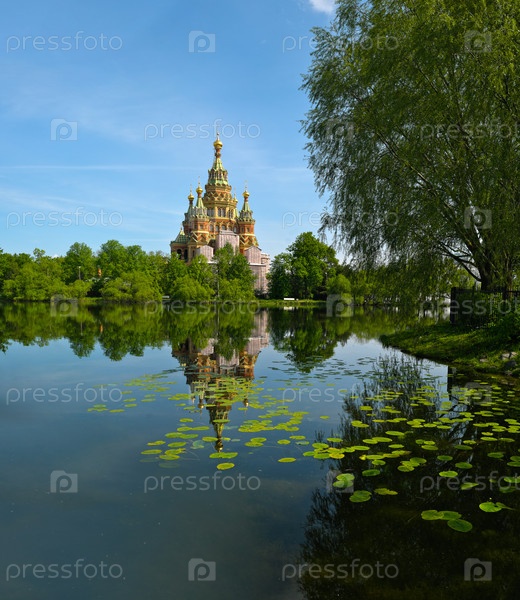 Собор святых Петра и Павла в Петровороце (Peterhof, Санкт-Петербург, Россия), зеркальное отражение в пруду Ольги с водяными лилиями, летнее спокойствие