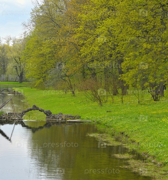 Весенний пейзаж Каскадного канала в парке Екатерины, Царское Село, Санкт-Петербург.Отражающая вода с декоративной дамбой и молодой лиственницей