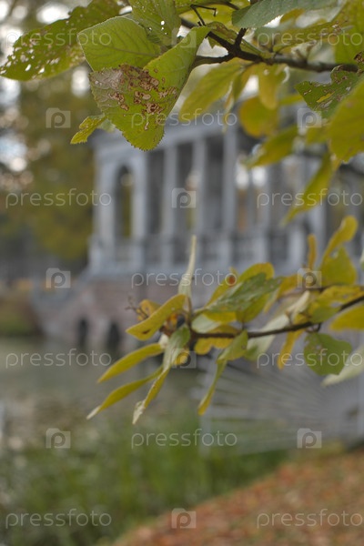 Мраморный мост осенью, дворцовый комплекс Царское Село недалеко от Санкт-Петербурга (Россия) Близкий вид листьев и ветвей на дереве с слегка расфокусированным фоном светло-серого здания и воды