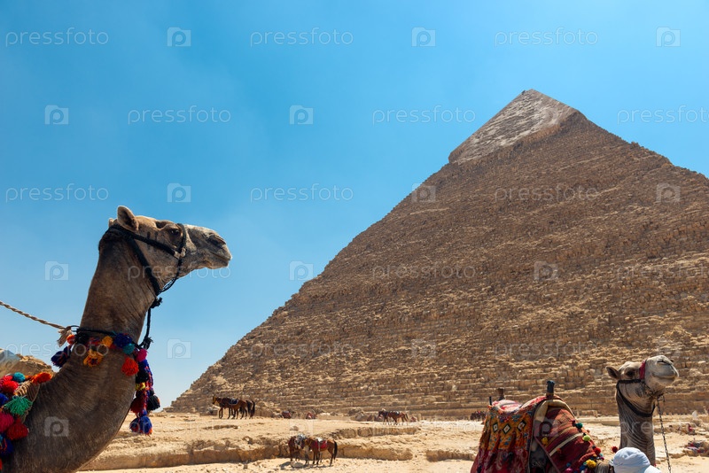 Верблюды отдыхают на фоне египетской пирамиды Хафры