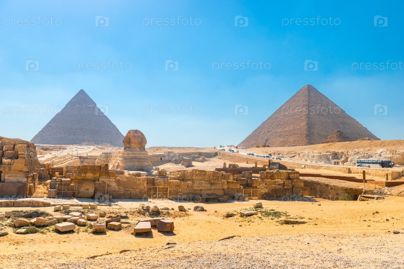 Живописный пейзаж с египетским Сфинксом на фоне древних пирамид под палящим солнцем пустыни Сахара