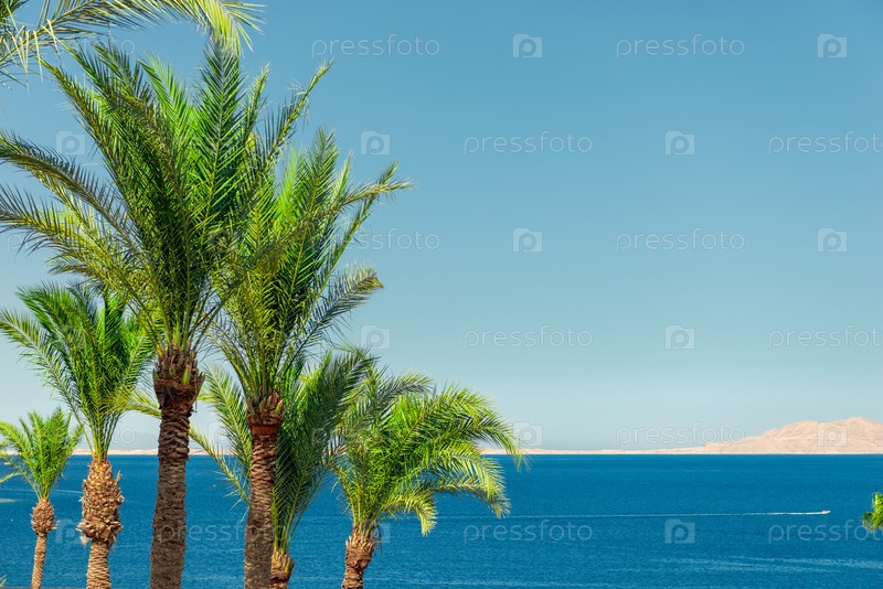 Тропический вид на пальмы с морем в фоне на пляжном курорте