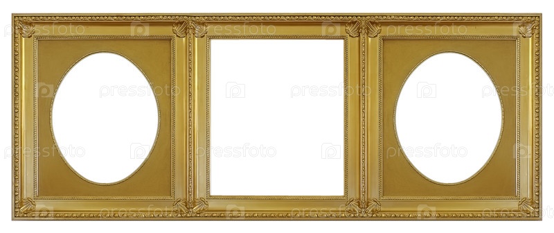 Тройная золотая рама (триптих) для картин, зеркал или фотографий, изолированных на белом фоне