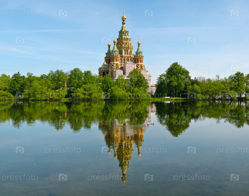 Собор святых Петра и Павла в Петровороце (Peterhof, Санкт-Петербург, Россия), зеркальное изображение в пруду Ольги, летнее спокойствие