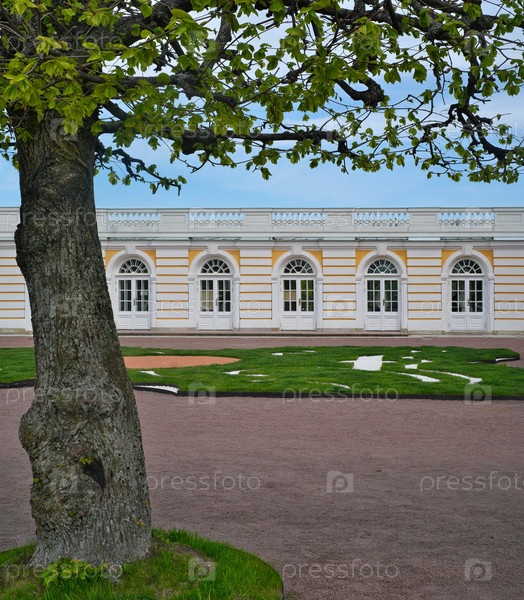 Западная галерея Дворца Большого Петергофа (Петродворец, Санкт-Петербург, Россия) весной и летом, вид на дворик со старым деревом и классической архитектурой из Верхнего парка