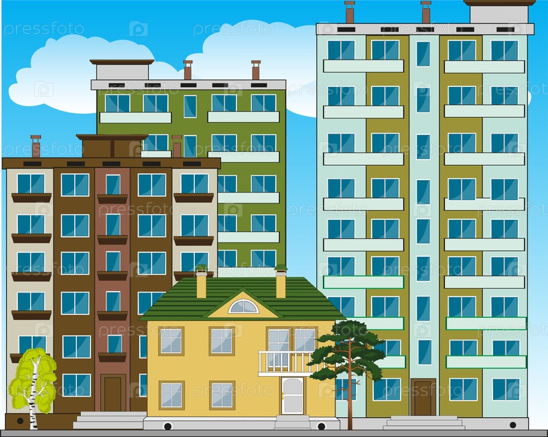 Векторная иллюстрация небольшого города с многоэтажными зданиями
