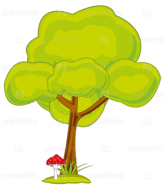 Годовые зеленые деревья и грибы летают агарикой в траве