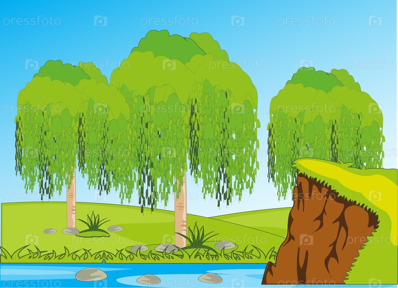Ежегодный ландшафт с рекой и деревьями на берегу