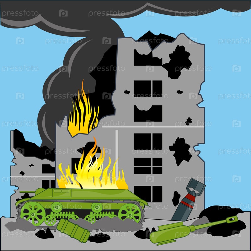Разрушенное военное здание и поврежденная танковая война в городе