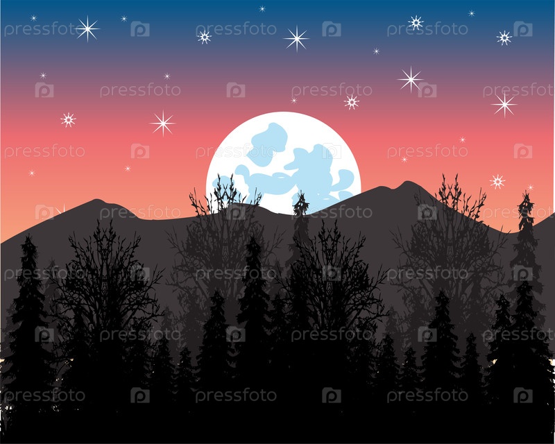 Красочный пейзаж лунной ночи на фоне гор и лесов