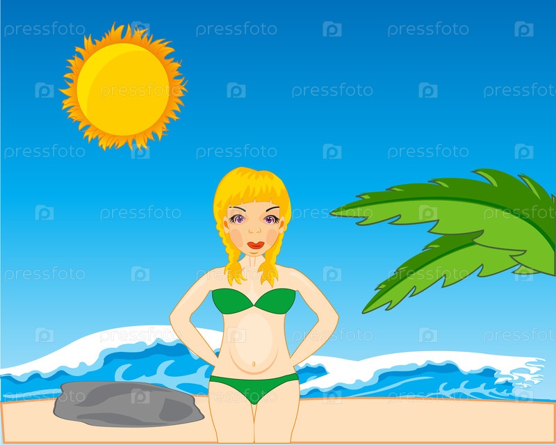 Тропический песок и красивая девушка на пляже