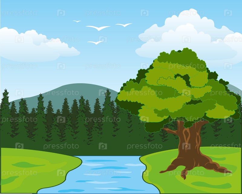 Красочный пейзаж с рекой и деревьями