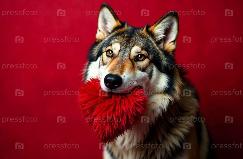 Карточка на День святого Валентина, волк с пушистым красным фоном сердца