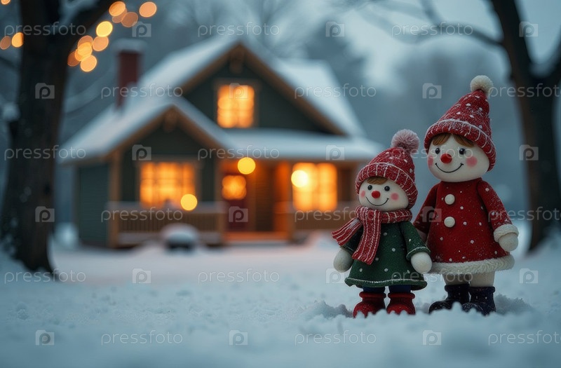 Новогодние статуэтки игрушек стоят на снежном фоне украшенного дома. искусственно созданные