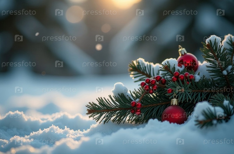 Рождественская ветвь, украшенная гирляндой, шаром и конусами, лежит в лесу зимой на снегу, яркий новогодний день