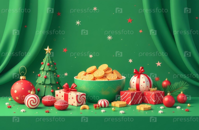 Искусственно созданный натюрморт с подарками, новогодние игрушки и рождественская елка стоит на столе, зеленые драпировки
