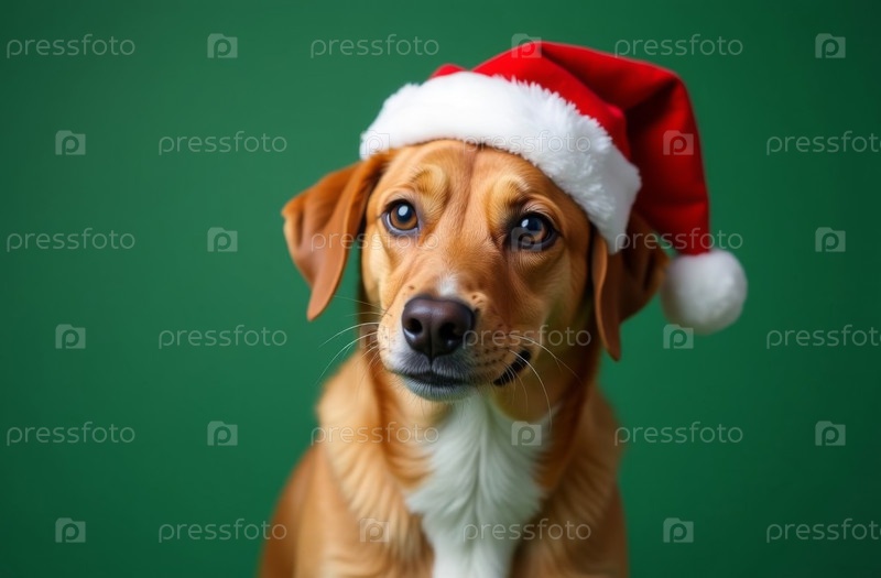 Новогодний портрет собаки в шляпе Санта-Клауса на зеленом, рождественской открытке. искусственно создан