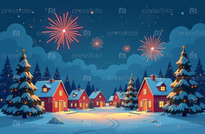 Новогодние фейерверки, пригород, дерево, звездная ночь. искусственно созданные