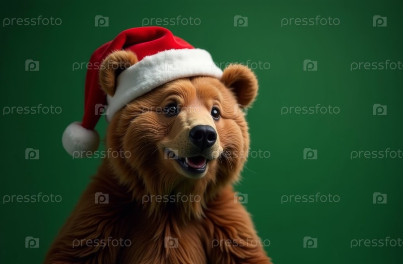 Новогодний портрет медведя в шляпе Санта-Клауса на зеленом, рождественская открытка. искусственно создан
