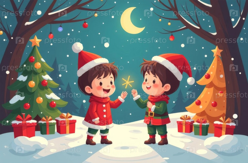 Дети танцуют вокруг рождественской елки на улице зимой, украшают пригороды в канун Нового года