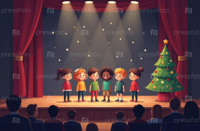 Дети показывают спектакль на сцене театра, зрители сидят в зале, новогодние украшения и рождественская елка