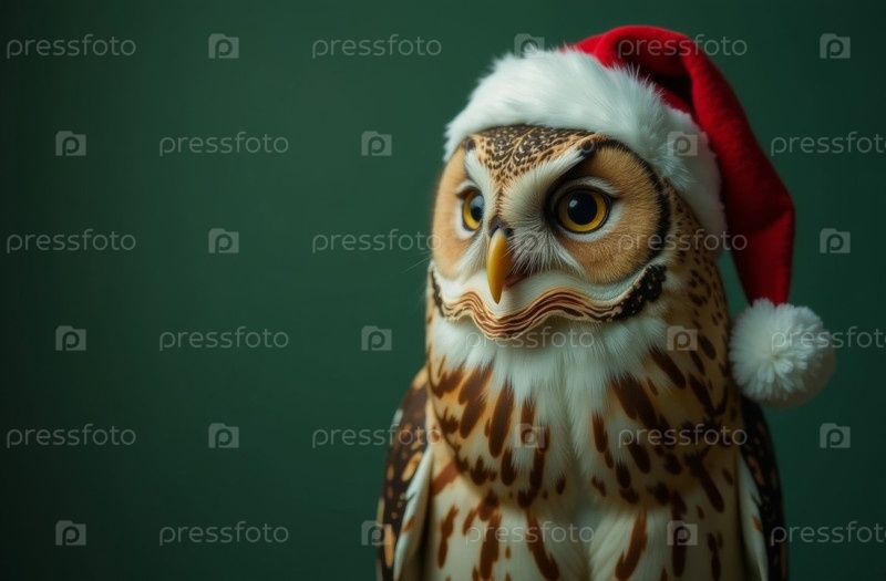 Портрет новогодней совы в шляпе Санты на зеленой рождественской открытке. искусственно создан