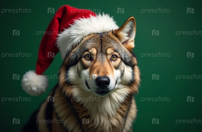 Новогодний портрет волка в шляпе Санта-Клауса на зеленом, рождественская открытка. искусственно создан