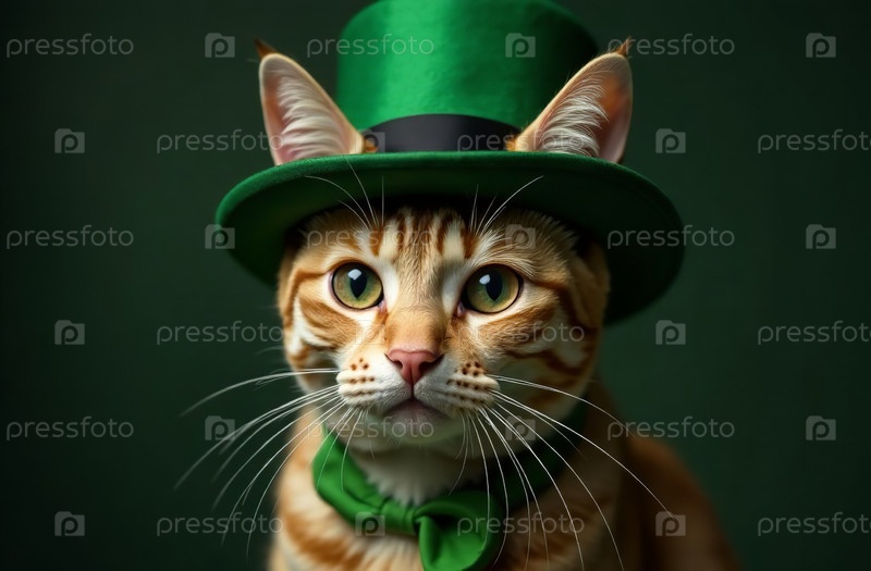 Кошка в традиционном зеленом ирландском костюме с шляпой, открытка на День Святого Патрика