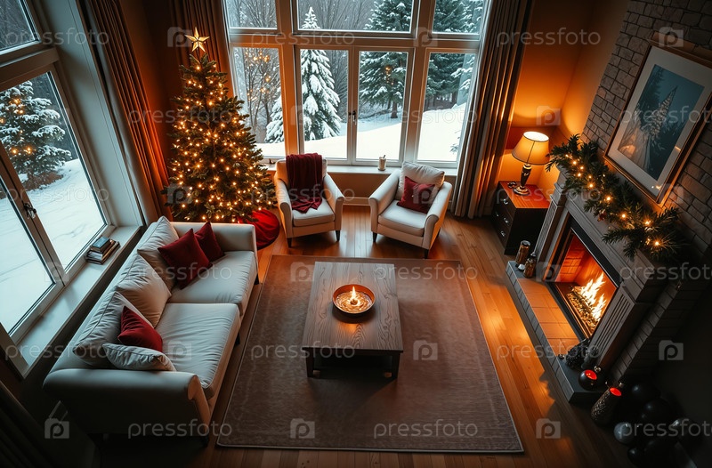 Новогодняя гостиная, украшенная рождественской елкой, снаружи зимой. искусственно создана