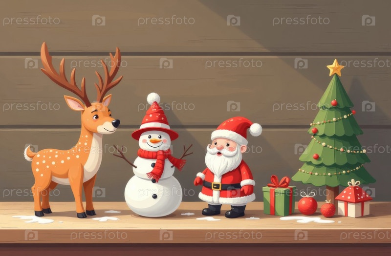 Созданный AI олень, снеговик, рождественская елка, коробка для подарков и Санта-Клаус стоят на деревянном столе, натюрморт новогодних игрушек