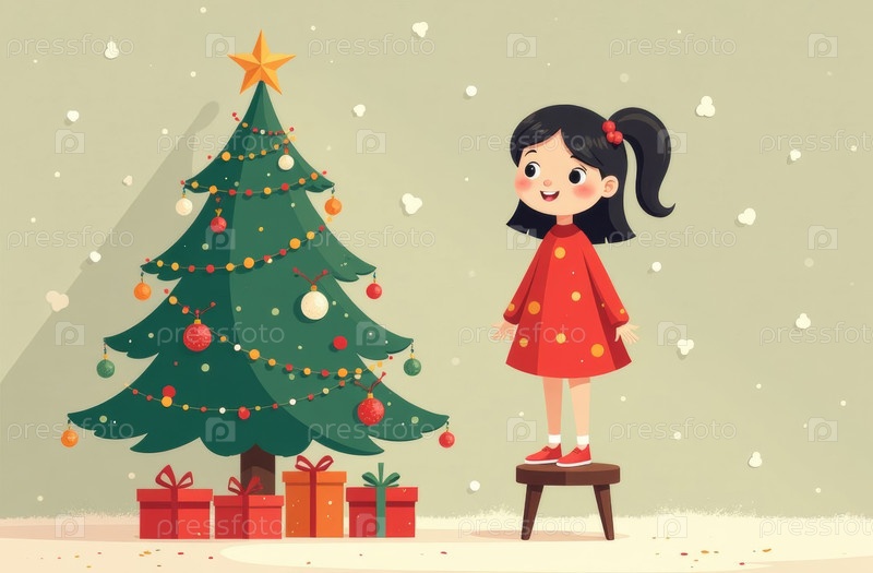 Искусственно созданный Ребенок стоит на стуле и читает новогоднее стихотворение, гирлянды украшают рождественскую елку и обертывают подарки, девушка в красном платье стоит на полу