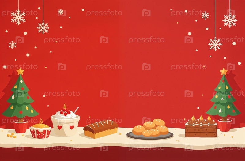 Созданная искусственным интеллектом рождественская выпечка, лежащая на красном столе, Новый год украшенный ледяными пирогами и тортами, открытка с пространством для текста