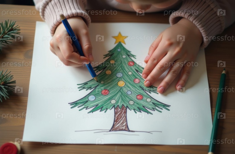 Детский рисунок украшен рождественской елкой, новогодним рисунком, ручным карандашом. искусственно создан