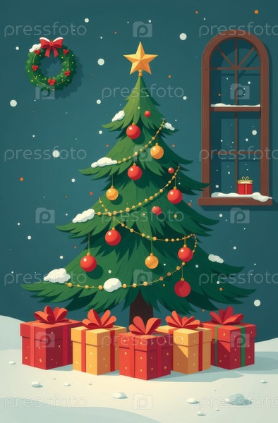 Декорированная рождественская елка упаковала подарки в стоящий лесный снег, Ева