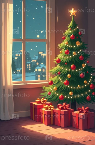 Рождественская елка упаковала подарки в гостиной, с окна выпал снег