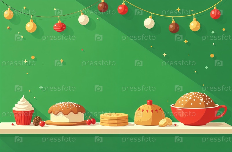 Созданная искусственным интеллектом рождественская выпечка, лежащая на зеленом столе, канун Нового года, украшенный ледяными пирогами и тортами, открытка с пространством для текста