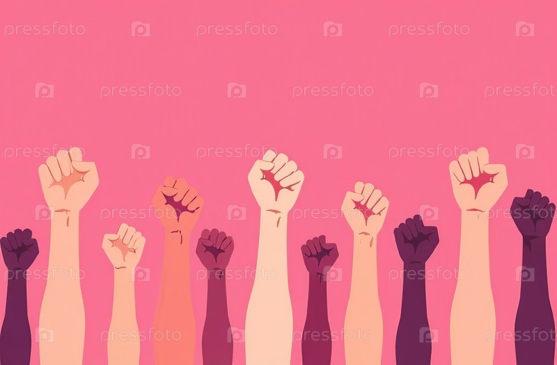 Руки женщин сжаты в кулак, символ феминизма, открытка к Международному женскому дню
