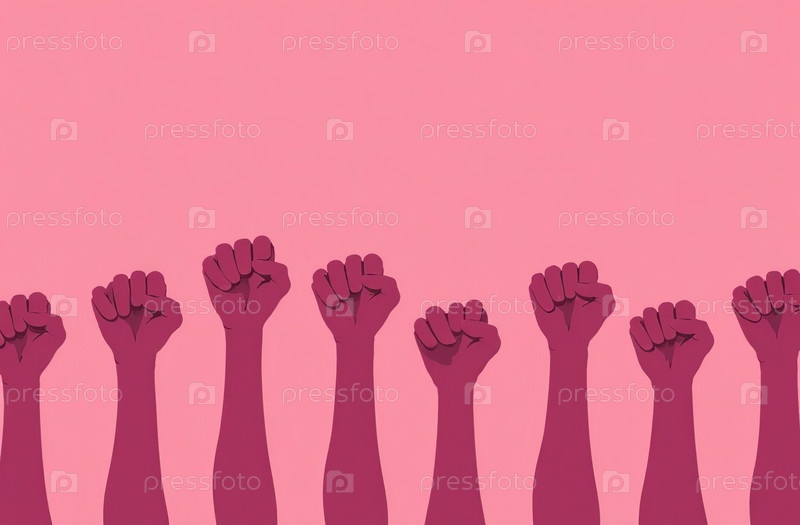 Руки женщин сжаты в кулак, символ феминизма, открытка к Международному женскому дню