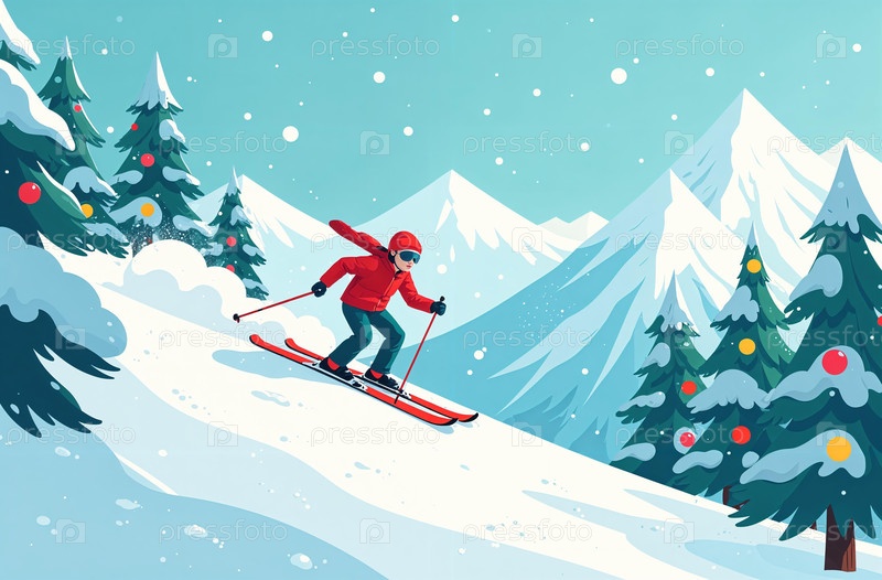 Созданный ИИ Человек катится по снежной горе на лыжах, горы и рождественская елка на заднем плане, новогодние праздники в горнолыжном курорте