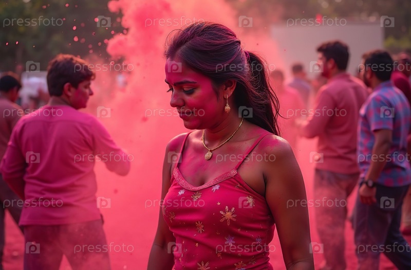 Женщина в брызгах красочного Холи рисует индийский весенний фестиваль