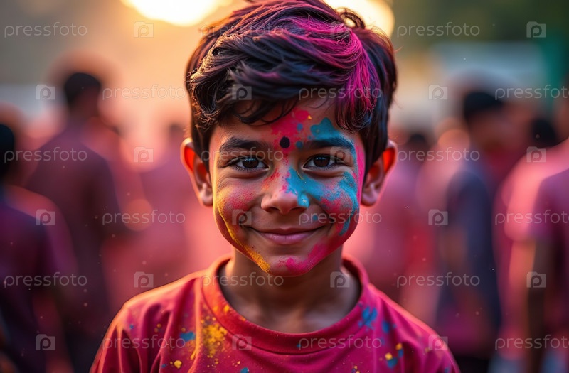 Мальчик в брызге красочного Холи рисует индийский весенний фестиваль