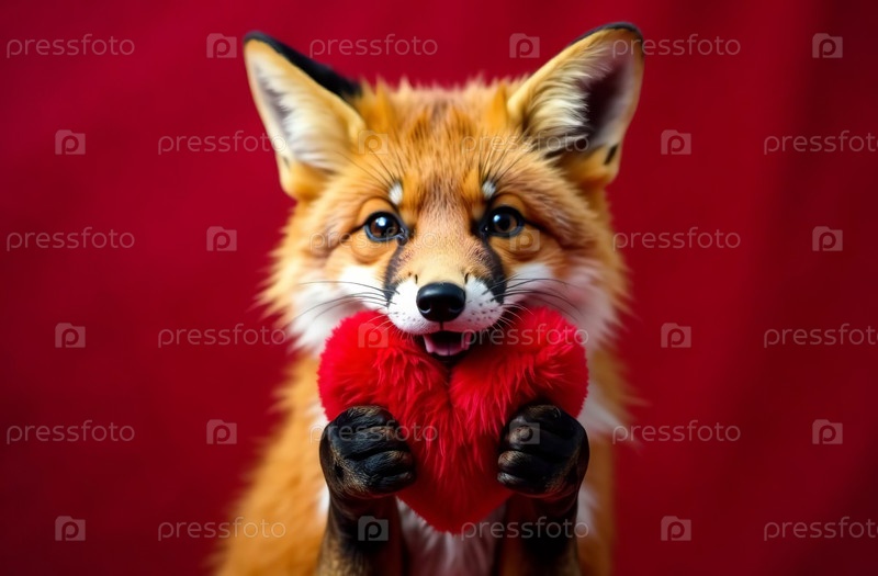 Карточка на День святого Валентина, лиса с пушистым красным фоном сердца