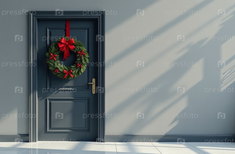Входная дверь украшает омель рождественской ветви, текст на стене. искусственно созданный