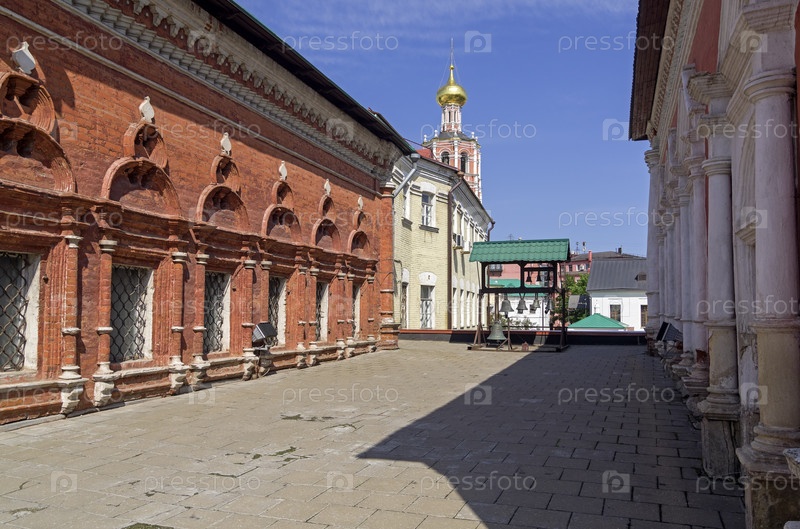 Небольшая колокольня в Высо-Петровском монастыре (расположенная между Сергиевской трапезой и Нарышкинскими палатами). Москва, улица Петровка. Солнечный день в июне