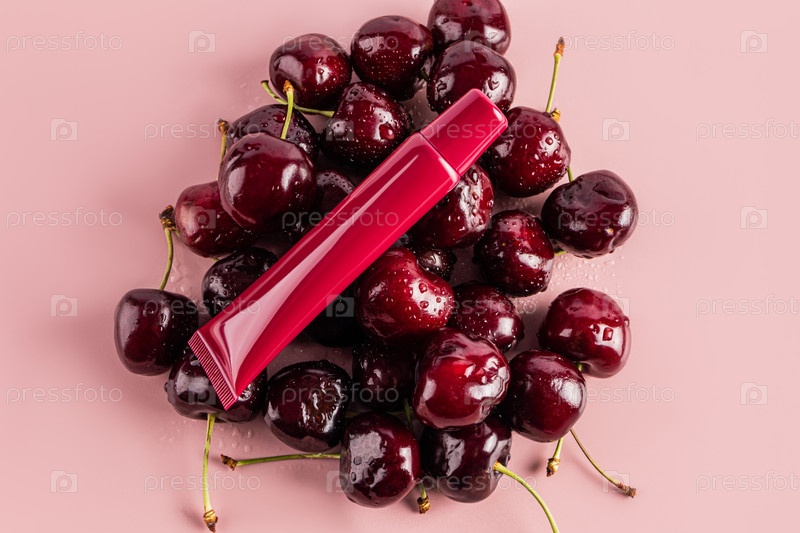 Трубка косметического продукта с естественной основой для ухода за губами, лечения и красоты лежит на спелых вишнях