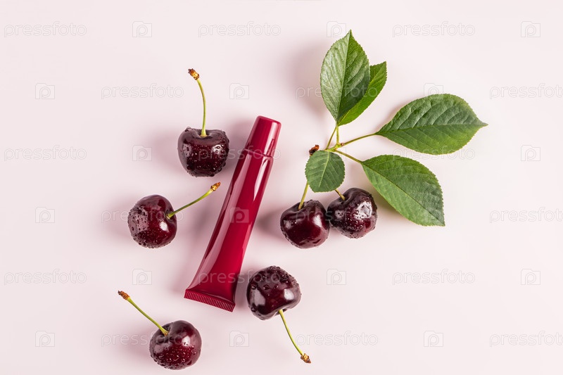 Бургундская трубка красоты с маской, бальзамом, блеском для губ на розовом фоне среди вишневых заклинаний. Вид сверху. Пустая упаковка. Реклама продукта