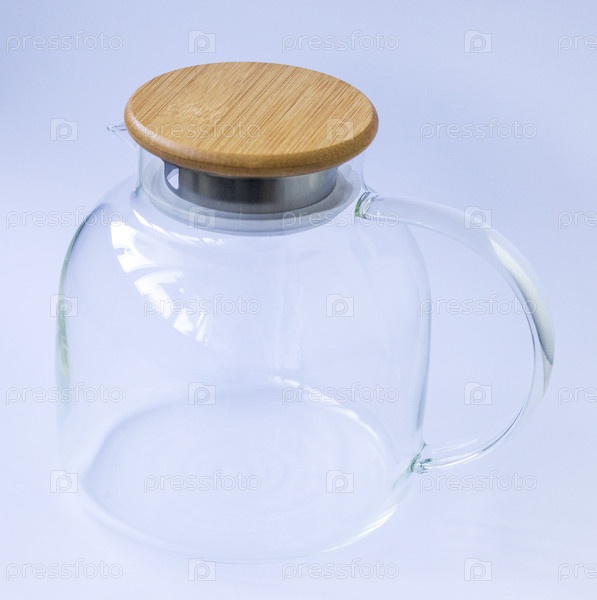 Стильный прозрачный чайник с деревянной крышкой на белом фоне. предметы домашнего обихода
