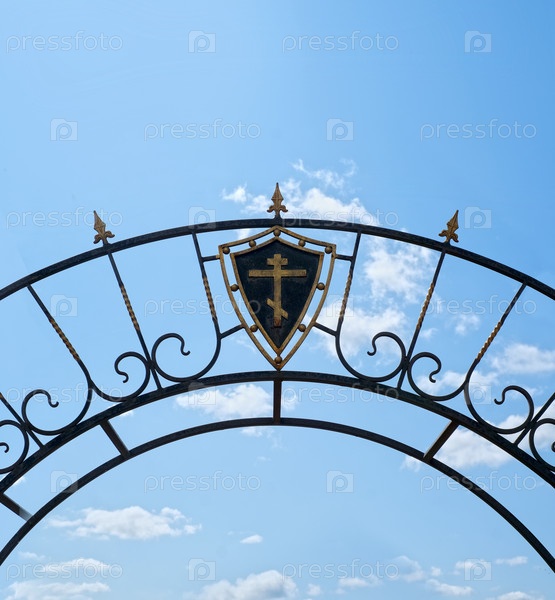Декоративная кованая железная арка с христианским крестом, изолированная на голубом небе, сложная черная металлическая конструкция, фон облачного пейзажа